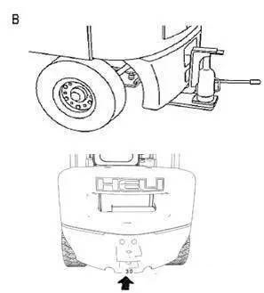 3.一定要在規(guī)定的頂起部位處把叉車頂起。